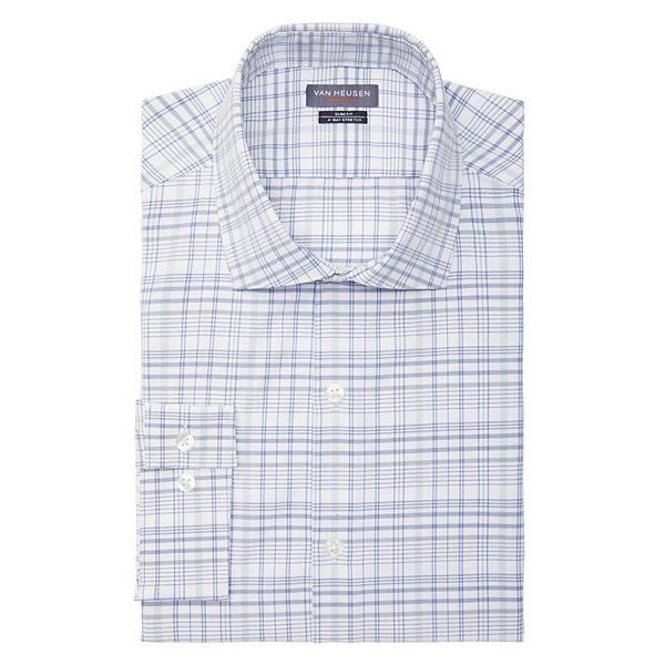. Stay comfortable all day wearing this Mens Van Heusen slim fit stretch dress shirt. The long sleeve shirt features a plaid print adjustable cuffs full. Made with recycled polyester.